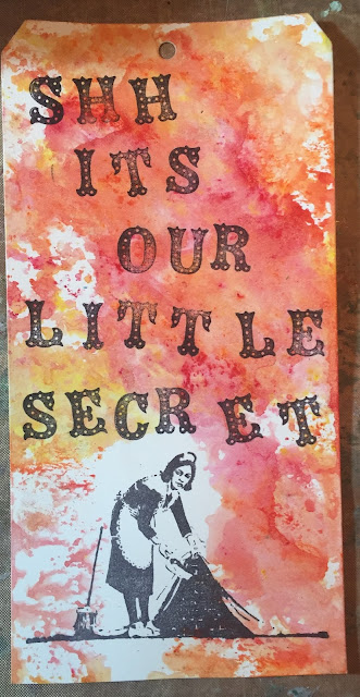 On a watercolor paper tag, stamp the image (Viva Las Vegas Stamps) with Archival Ink Jet Black. Around the image create a background with the watercolor smooshing technique using watercolor crayons. Let dry. Stamp phrase with letter stamps (Recollections) and Archival Ink Jet Black.